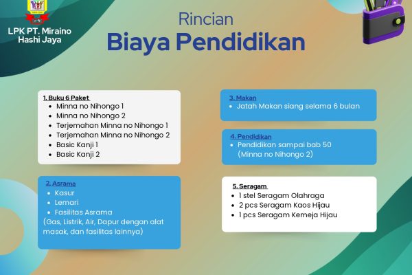Fasilitas lengkap yang diterima selama pendidikan dan pelatihan di LPK Mirai no Hashi untuk mempersiapkan karir di Jepang.